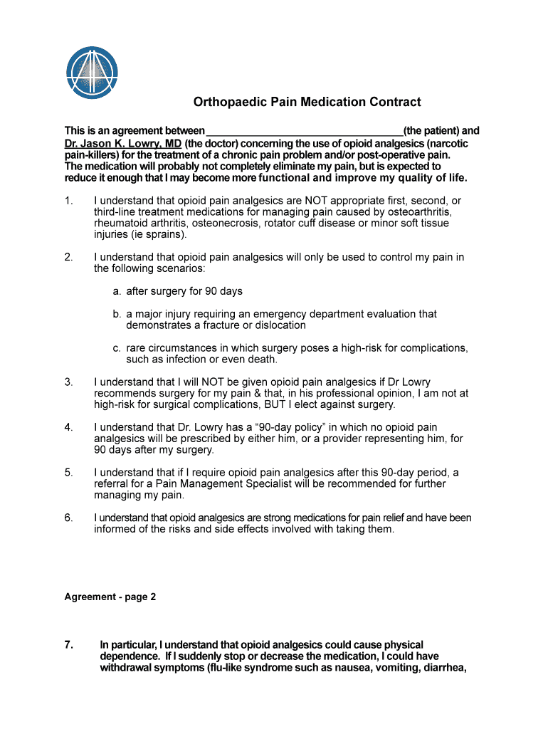 ! ! Orthopedic Pain Medication Contract This is an agreement between (the patient) and Dr. Jason K. Lowry, MD (the doctor) concerning the use of opioid analgesics (narcotic painkillers) for the treatment