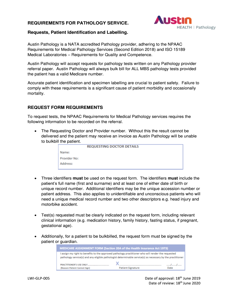 REQUIREMENTS FOR PATHOLOGY SERVICE. Requests, Patient Identification and Labelling. Austin Pathology is a DATA accredited Pathology provider, adhering to the NP AAC Requirements for Medical Pathology