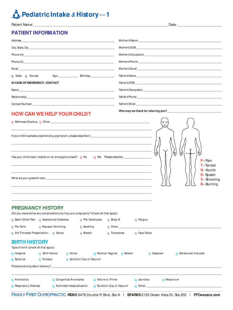 Pediatric Intake & History1 Patient Name: Date: PATIENT INFORMATION Address Mothers Name City, State, Zip Mothers DOB Phone (H) Mothers Occupation Phone © Mothers Phone Email Mothers Email q Male