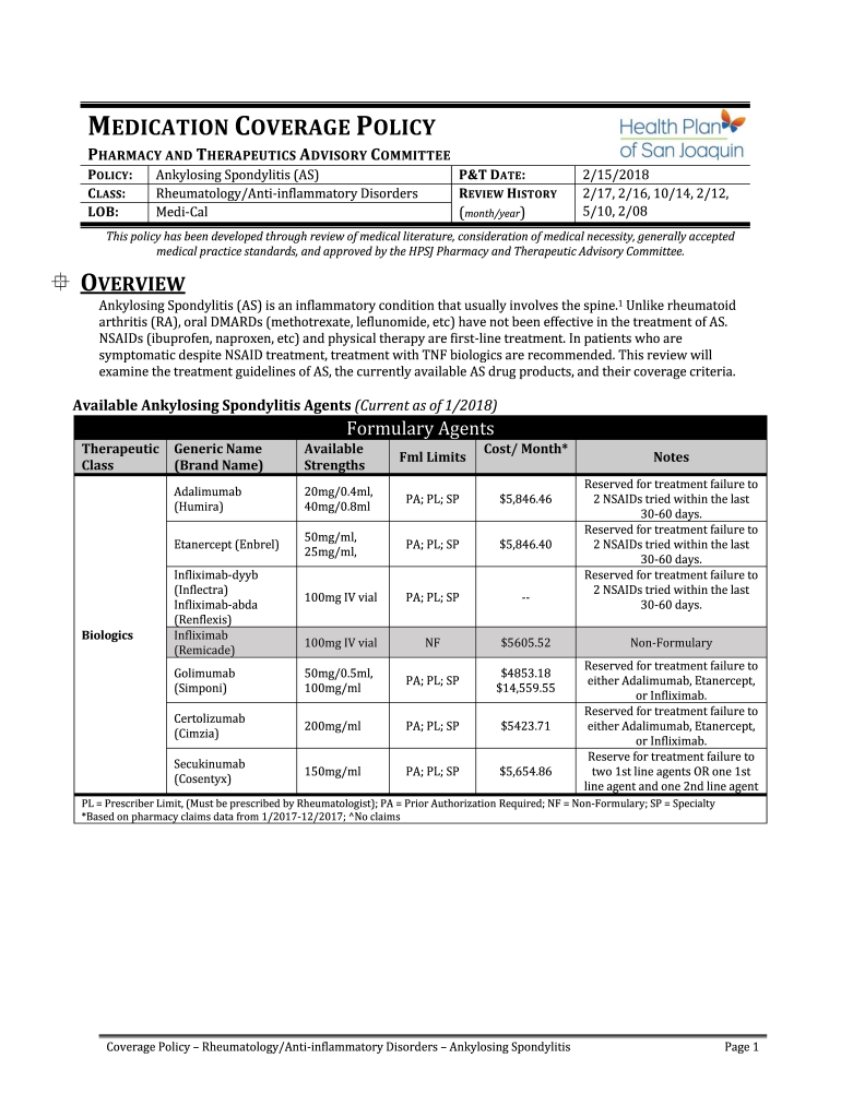 MEDICATION COVERAGE POLICY PHARMACY AND THERAPEUTICS ADVISORY COMMITTEE POLICY: CLASS: LOB:Ankylosing Spondylitis (AS) Rheumatology/Antiinflammatory Disorders Medical DATE: REVIEW HISTORY(month/year)2/15/2018