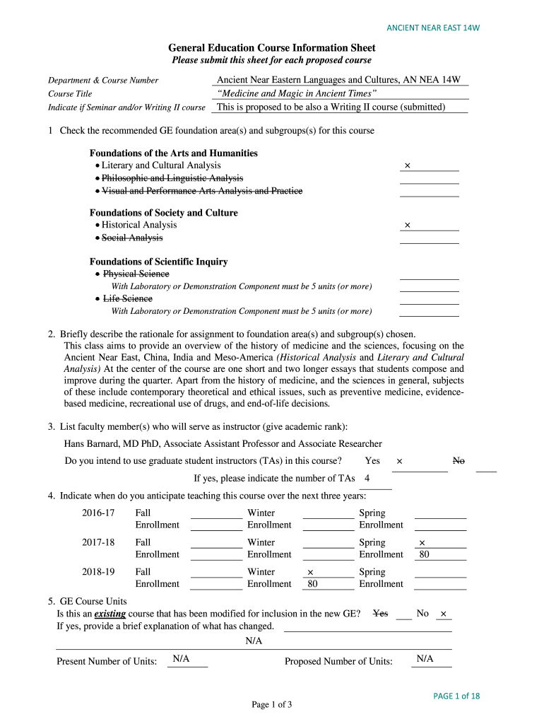 ANCIENT NEAR EAST 14WGeneral Education Course Information Sheet Please submit this sheet for each proposed course Department & Course Number Course Title Indicate if Seminar and/or Writing II courseAncient
