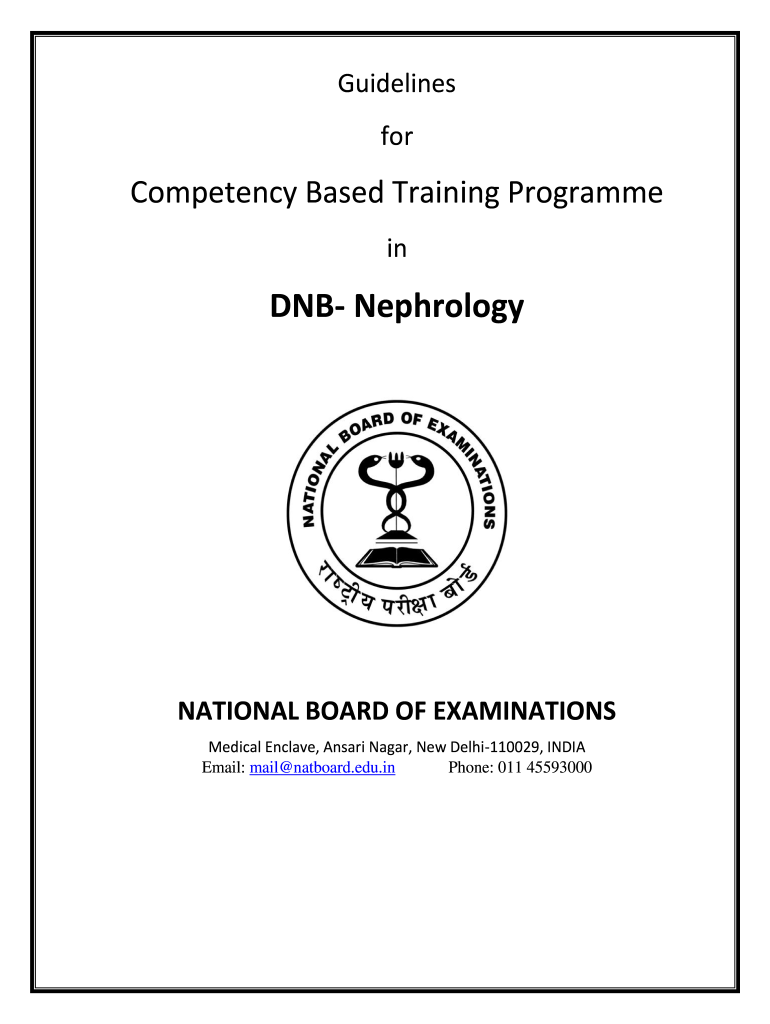 Guidelines competency Based Training Program in DNB NephrologyNATIONAL BOARD OF EXAMINATIONS Medical Enclave, An sari Nagar, New Delhi110029, INDIA Email: mail aboard.edu.in Phone: 011 45593000CONTENTS