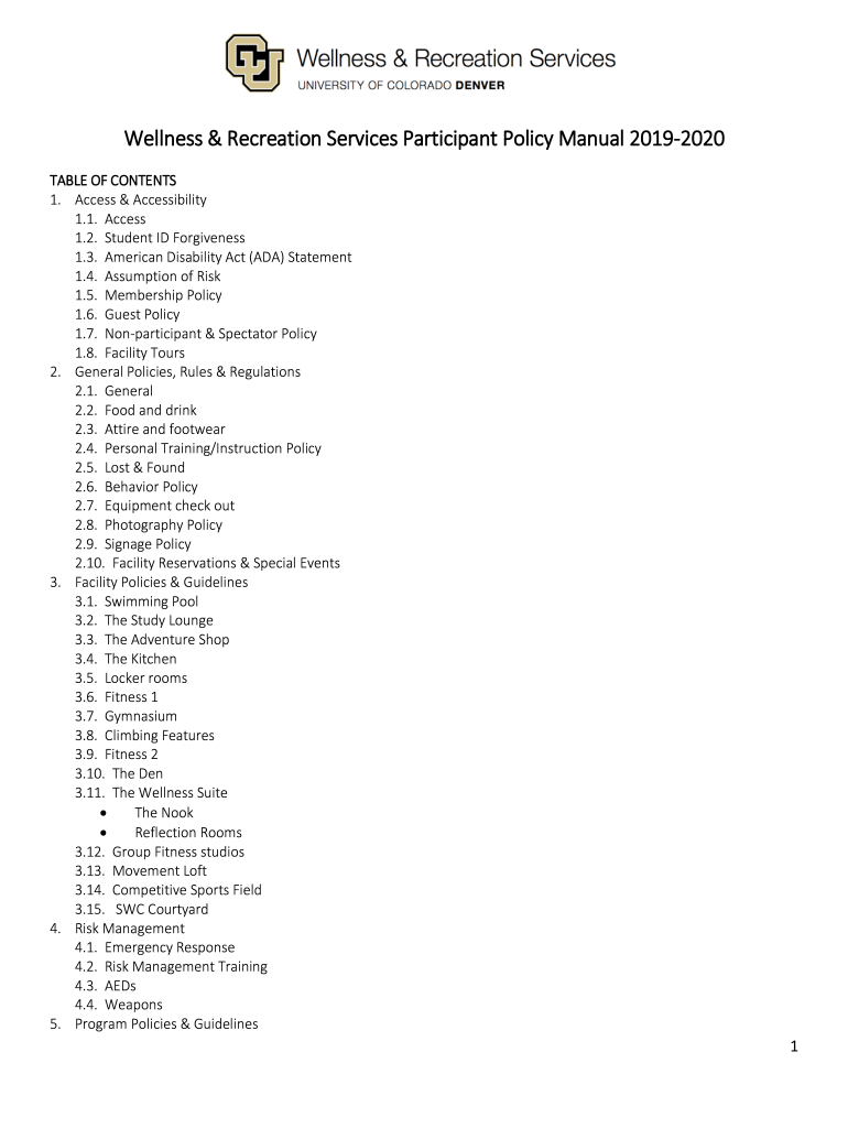 Get the free Wellness & Recreation Services Participant Policy Manual 2019-2020