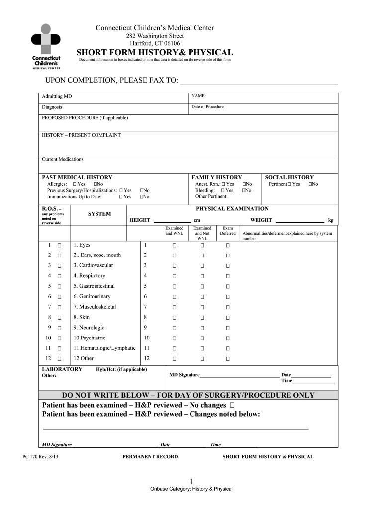 Connecticut Children's Medical Center 282 Washington Street Hartford, CT 06106SHORT FORM HISTORY PHYSICAL Document information in boxes indicated or note that data is detailed on the reverse side