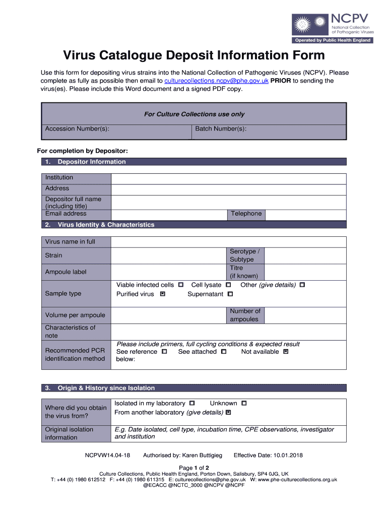 Get the free Virus Catalogue Deposit Information Form - Culture Collections
