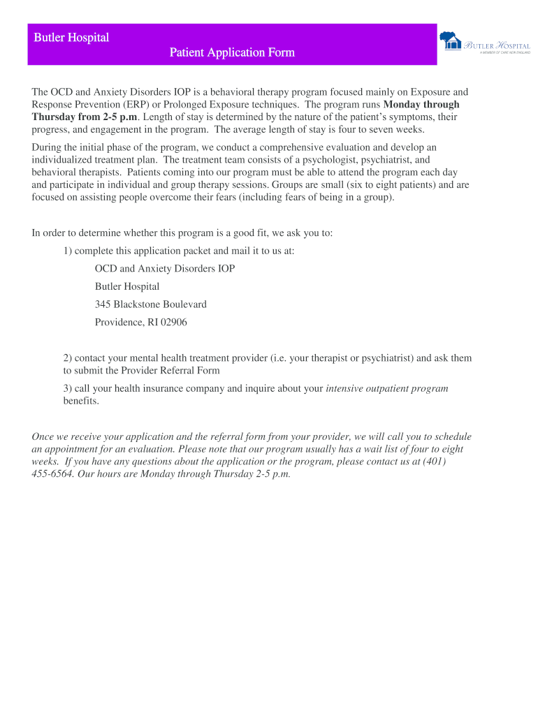 Patients seeking admission or services at Butler Hospital are required to file the Butler Hospital Patient Application.
