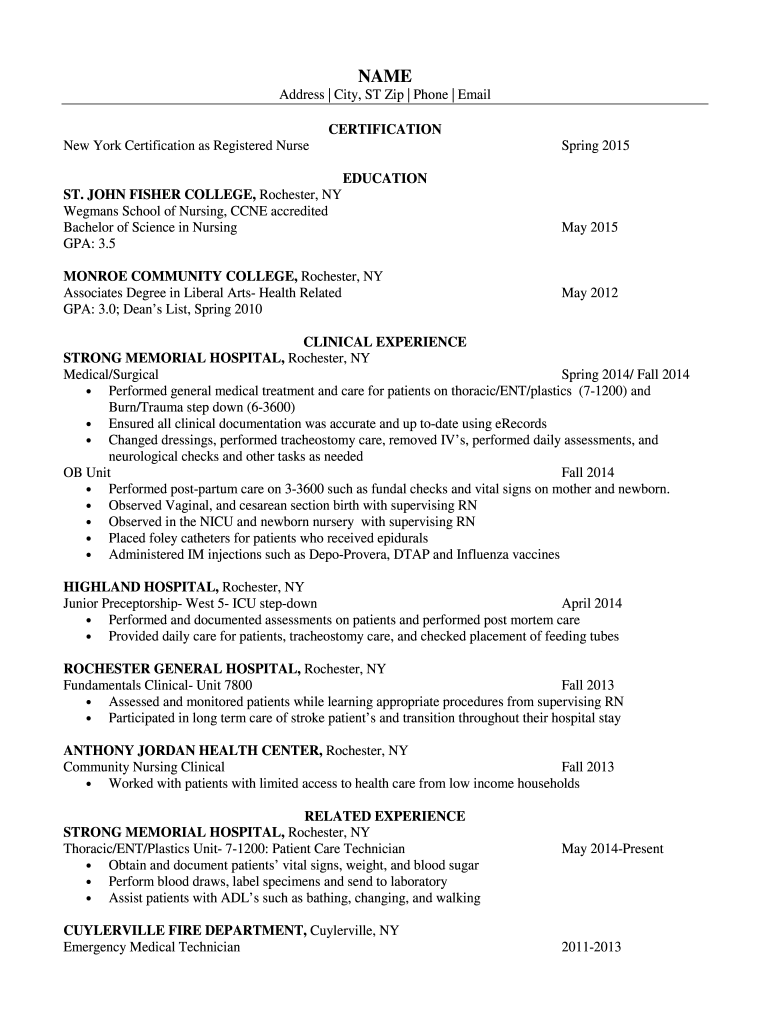NAME Address City, ST Zip Phone Email CERTIFICATION New York Certification as Registered NurseSpring 2015 EDUCATIONS. JOHN FISHER COLLEGE, Rochester, NY Germans School of Nursing, CCNE accredited