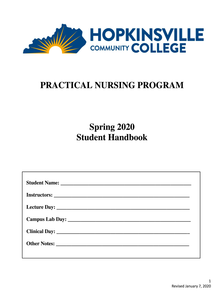 PRACTICAL NURSING Programming 2020 Student HandbookStudent Name: Instructors: Lecture Day: Campus Lab Day: Clinical Day: Other Notes: 1 Revised January 7, 2020Table of Contents INTRODUCTION ..........................................................................................................................................................................................