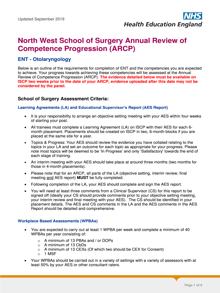 Updated September 2019North West School of Surgery Annual Review of Competence Progression (ARC) ENT Otolaryngology Below is an outline of the requirements for completion of ENT and the competencies