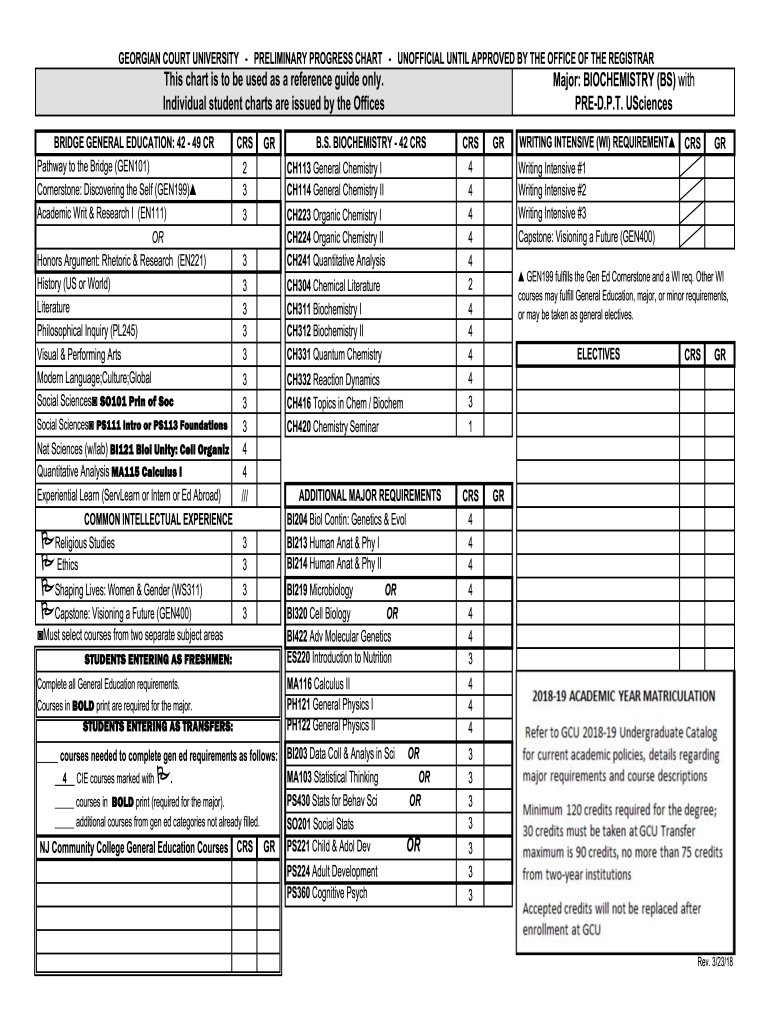 GEORGIAN COURT UNIVERSITY PRELIMINARY PROGRESS CHART UNOFFICIAL UNTIL APPROVED BY THE OFFICE OF THE Registrants chart is to be used as a reference guide only. Individual student charts are issued
