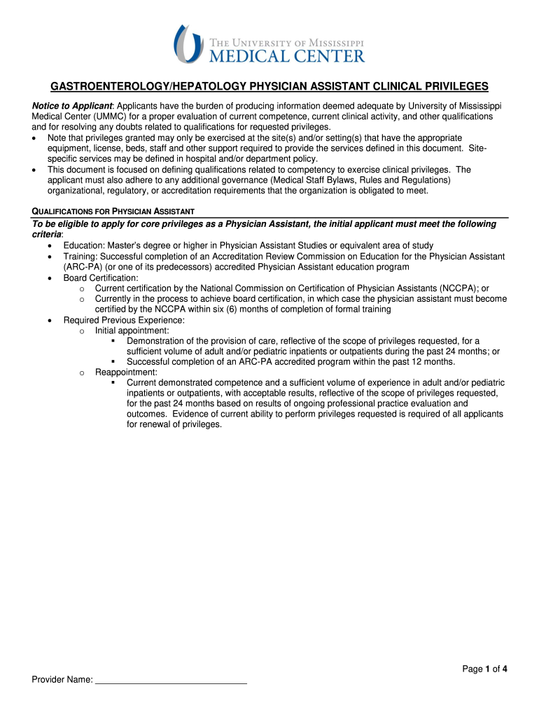 GASTROENTEROLOGY/HEPATOLOGY PHYSICIAN ASSISTANT CLINICAL PRIVILEGES Notice to Applicant: Applicants have the burden of producing information deemed adequate by University of Mississippi Medical Center