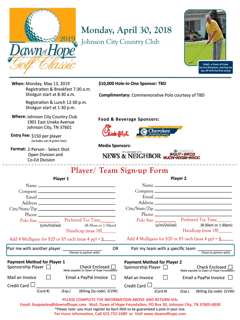 Monday, April 30, 2018 2019 Johnson City Country Club Ralph, aDawnofHope ServiceRecipient, starting the dayowiththefirstswing! When:Monday,May13,2019 Registry on&Breakfast7:30a.m. Shotgunstartat8:30a.m.