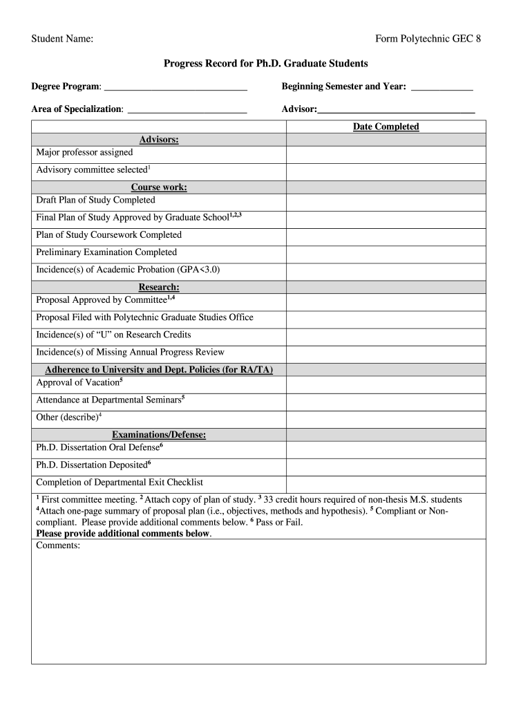 Student Name:Form Polytechnic GET 8 Progress Record for Ph.D. Graduate StudentsDegree Program: Beginning Semester and Year: Area of Specialization: Advisor: Date CompletedAdvisors: Major professor