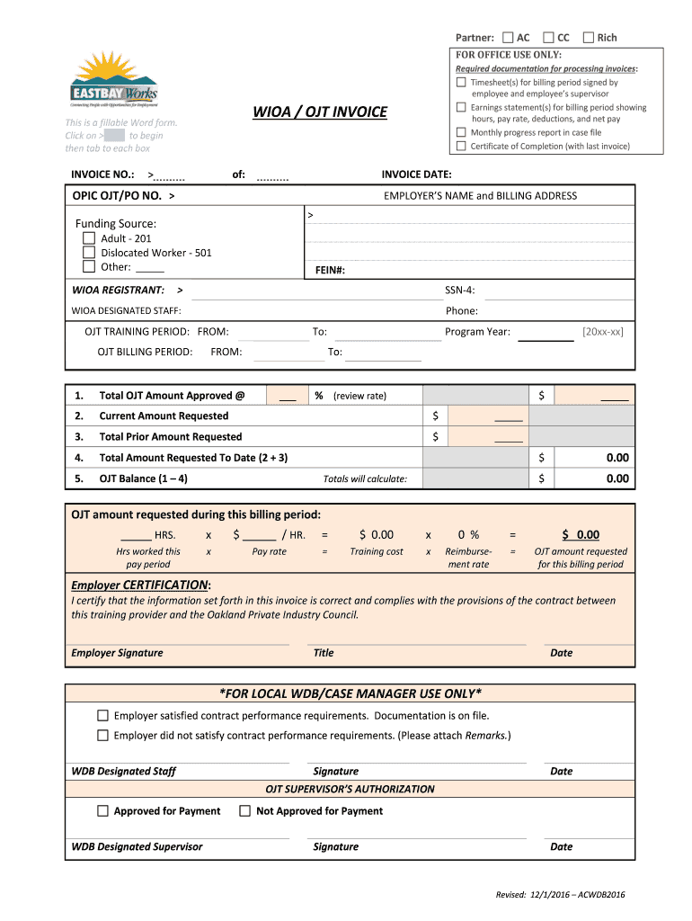 Partner:ACCCRichFOR OFFICE USE ONLY:WHOA / OUT Invoices is a fillable Word form. Click on to begin then tab to each invoice NO.:of:INVOICE DATE:EPIC OUT/PO NO. EMPLOYERS NAME and BILLING ADDRESS Funding