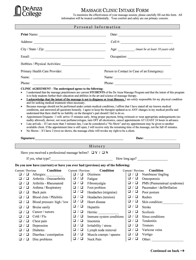 MASSAGE CLINIC INTAKE FORM To maximize the effectiveness of your massage session, please carefully fill out this form. All information will be treated confidentially. Your comfort and safety are our