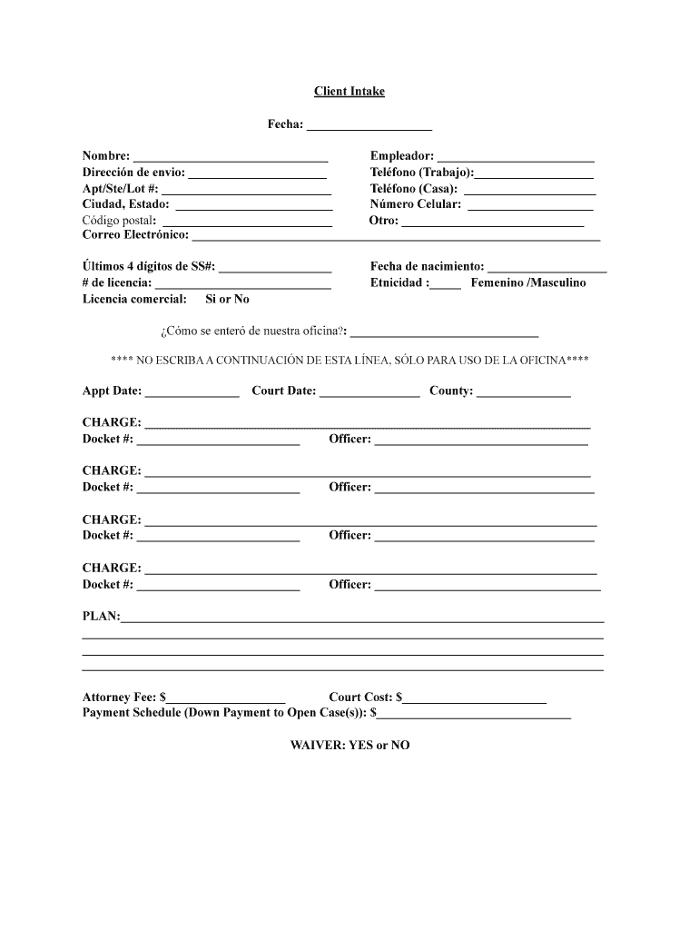 Client Intake Tech: Hombre: Emperor: Direction DE evil: Teflon (Tribal): Apt/Ste/Lot #: Teflon (Casey): Ciudad, Est ado: Nero Cellular: Cargo postal: Otto: Core Electric: limos 4 digits de SS#: #