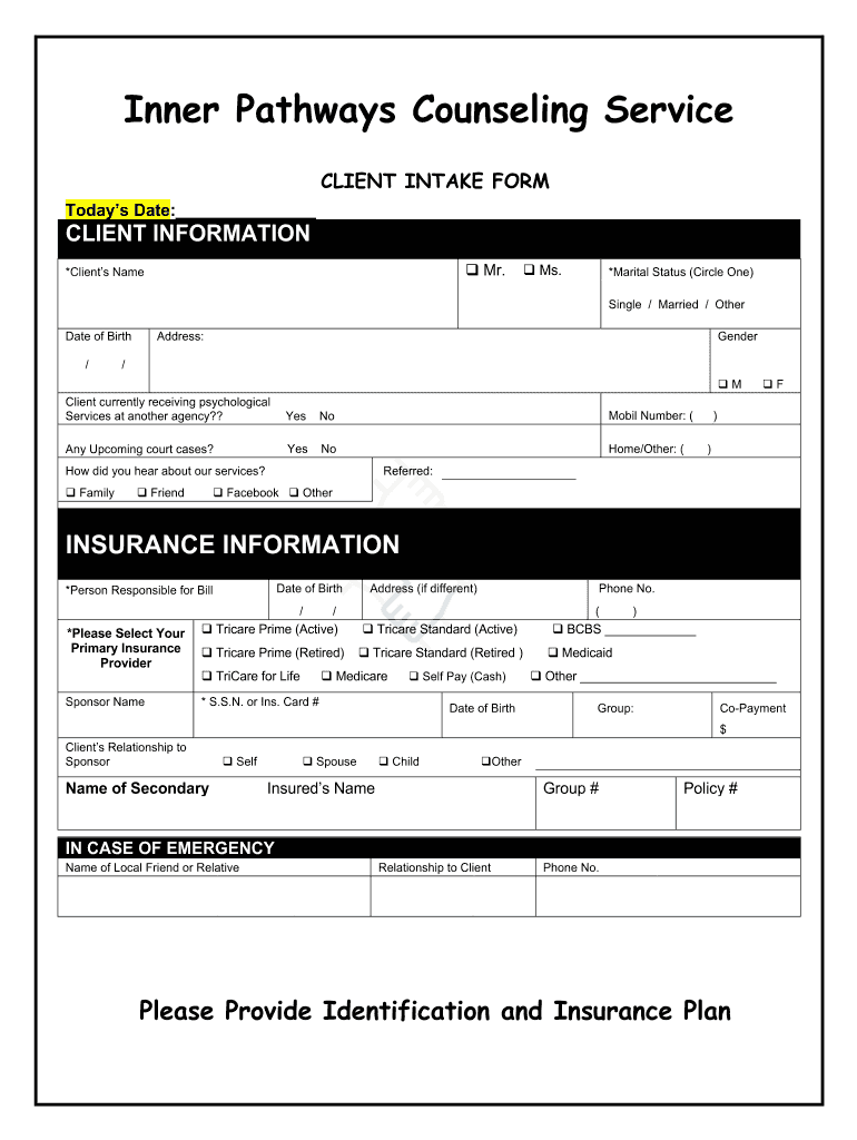 Inner Pathways Counseling Service CLIENT INTAKE FORM Today's Date: CLIENT INFORMATION / / q Mr.×Clients Name Ms.×Marital Status (Circle One) Single / Married / Operate of Birth /Address:Gender/