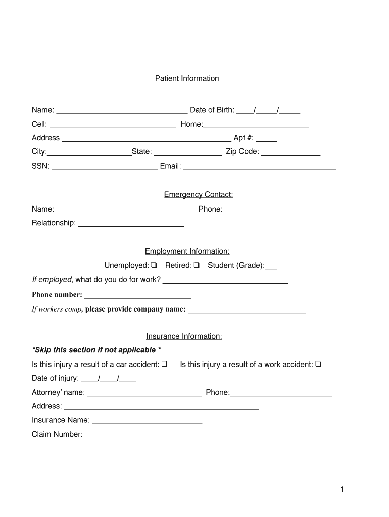 Patient Informational: Date of Birth: / / Cell: Home: Address Apt #: City: State: Zip Code: SSN: Email: Emergency Contact: Name: Phone: Relationship: Employment Information: Unemployed: Retired: Student