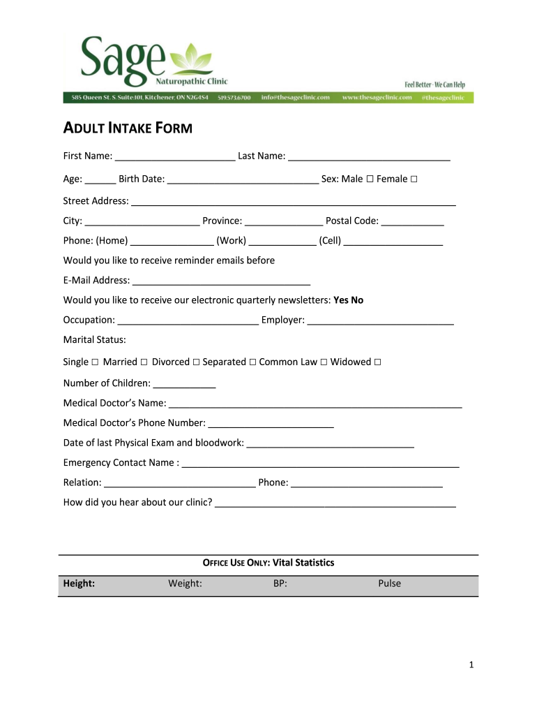 ADULT INTAKE FORM First Name: Last Name: Age: Birth Date: Sex: Male Female Street Address: City: Province: Postal Code: Phone: (Home) (Work) (Cell) Would you like to receive reminder emails before