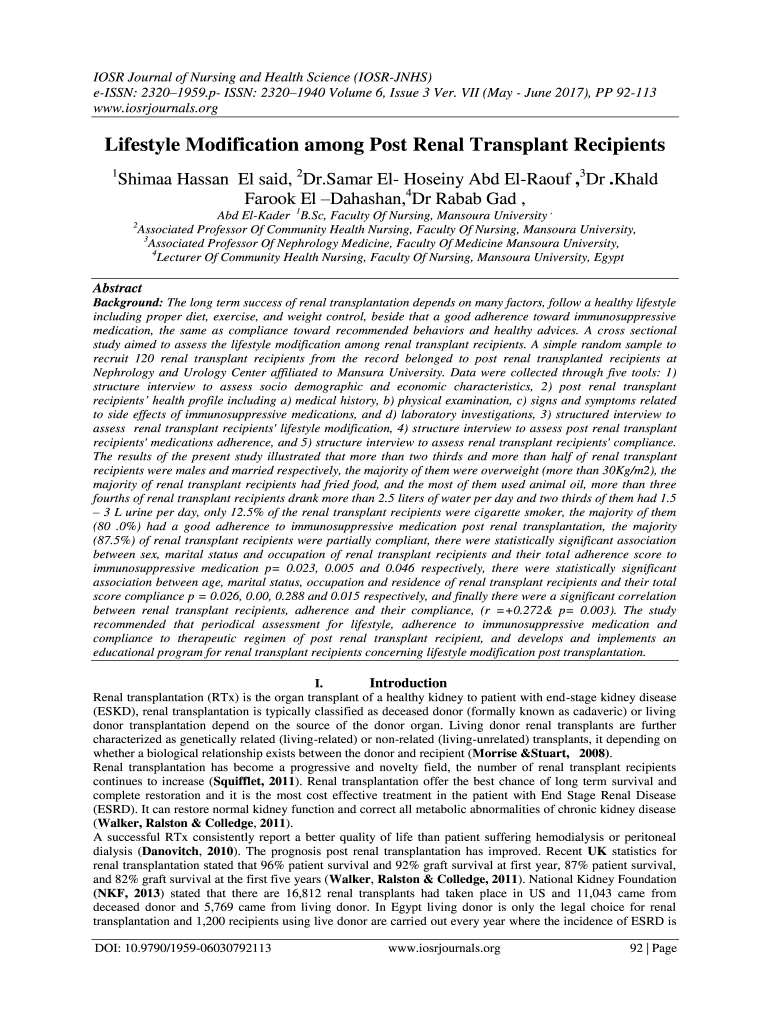 IOR Journal of Nursing and Health Science (IOSRJNHS) ISSN: 23201959.p ISSN: 23201940 Volume 6, Issue 3 Very. VII (May June 2017), PP 92113 www.iosrjournals.orgLifestyle Modification among Post Renal