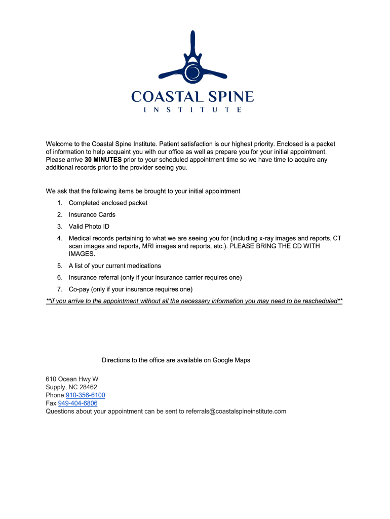 Welcome to the Coastal Spine Institute. Patient satisfaction is our highest priority. Enclosed is a packet