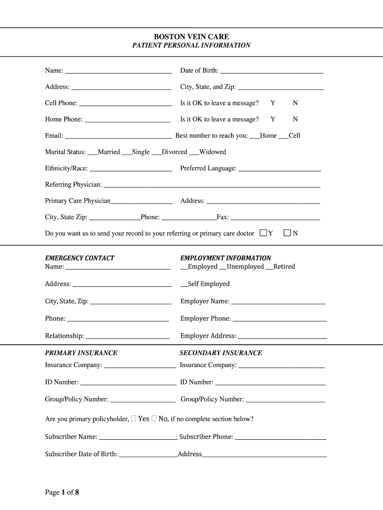 BOSTON VEIN CARE PATIENT PERSONAL Informational: Date of Birth: Address: City, State, and Zip: Cell Phone: Is it OK to leave a message? Home Phone: Is it OK to leave a message? Email: the Best number