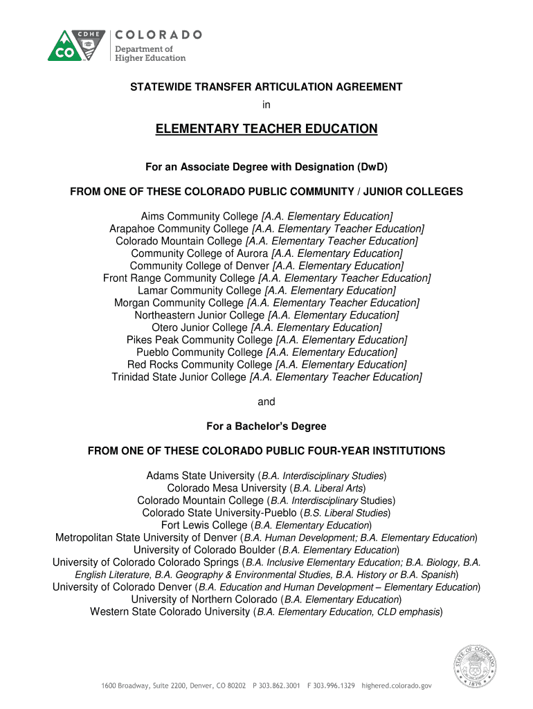 STATEWIDE TRANSFER ARTICULATION AGREEMENT elementary TEACHER EDUCATION For an Associate Degree with Designation (Did) FROM ONE OF THESE COLORADO PUBLIC COMMUNITY / JUNIOR COLLEGES Aims Community College
