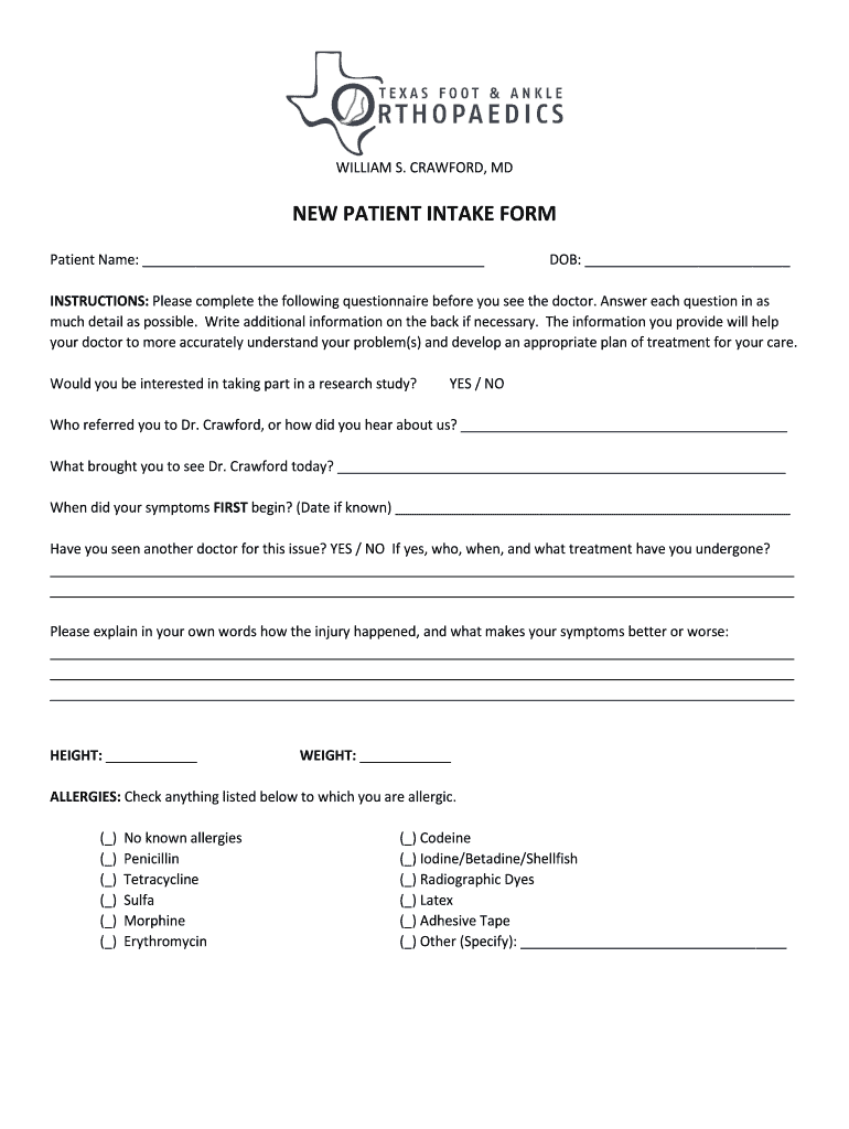 WILLIAM S. CRAWFORD, MDN EW PATIENT INTAKE FORM Patient Name: DOB: INSTRUCTIONS: Please complete the following questionnaire before you see the doctor. Answer each question in as much detail as possible.