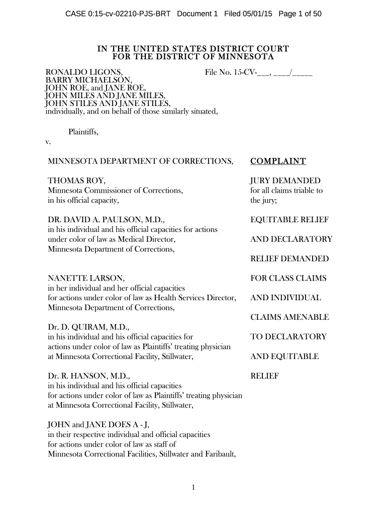 CASE 0:15cv02210PJSBRT Document 1 Filed 05/01/15-Page 1 of 50IN THE UNITED STATES DISTRICT COURT FOR THE DISTRICT OF MINNESOTA RONALDO LIONS, File No. 15CV, / BARRY MICHELSON, JOHN ROE, and JANE ROE,