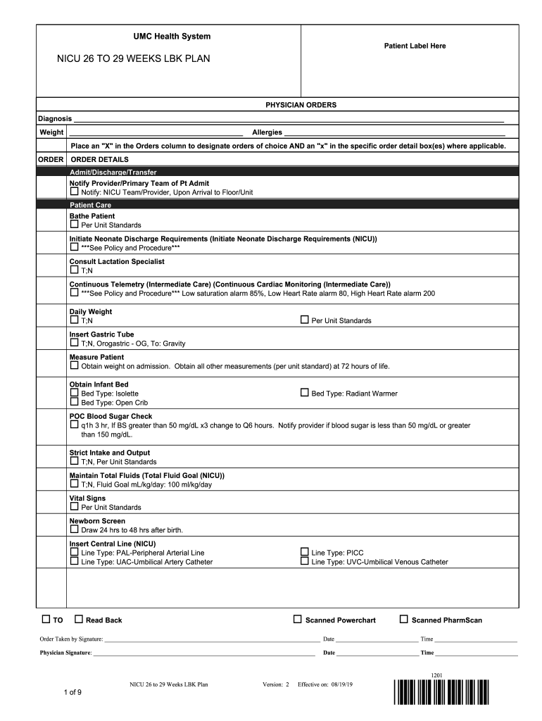 UMC Health System Patient Label Heretics 26 TO 29 WEEKS LB PATAPHYSICIAN ORDERS Diagnosis Weight Allergies Place an “X in the Orders' column to designate orders of choice AND an “x in the specific