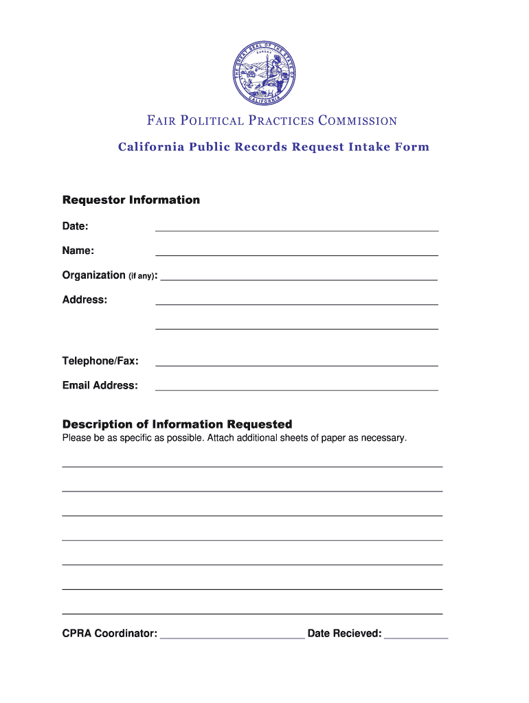 F AIR P POLITICAL P PRACTICES C COMMISSION California Public Records Request Intake FormRequestor Information Date: Name: Organization (if any): Address: Telephone/Fax: Email Address: Description