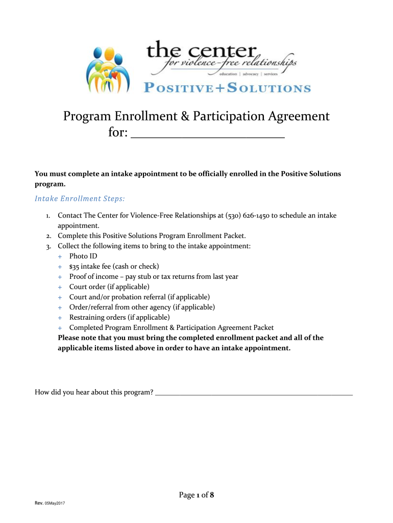 Program Enrollment & Participation Agreement for: You must complete an intake appointment to be officially enrolled in the Positive Solutions program. Intake Enrollment Steps: 1. Contact The Center