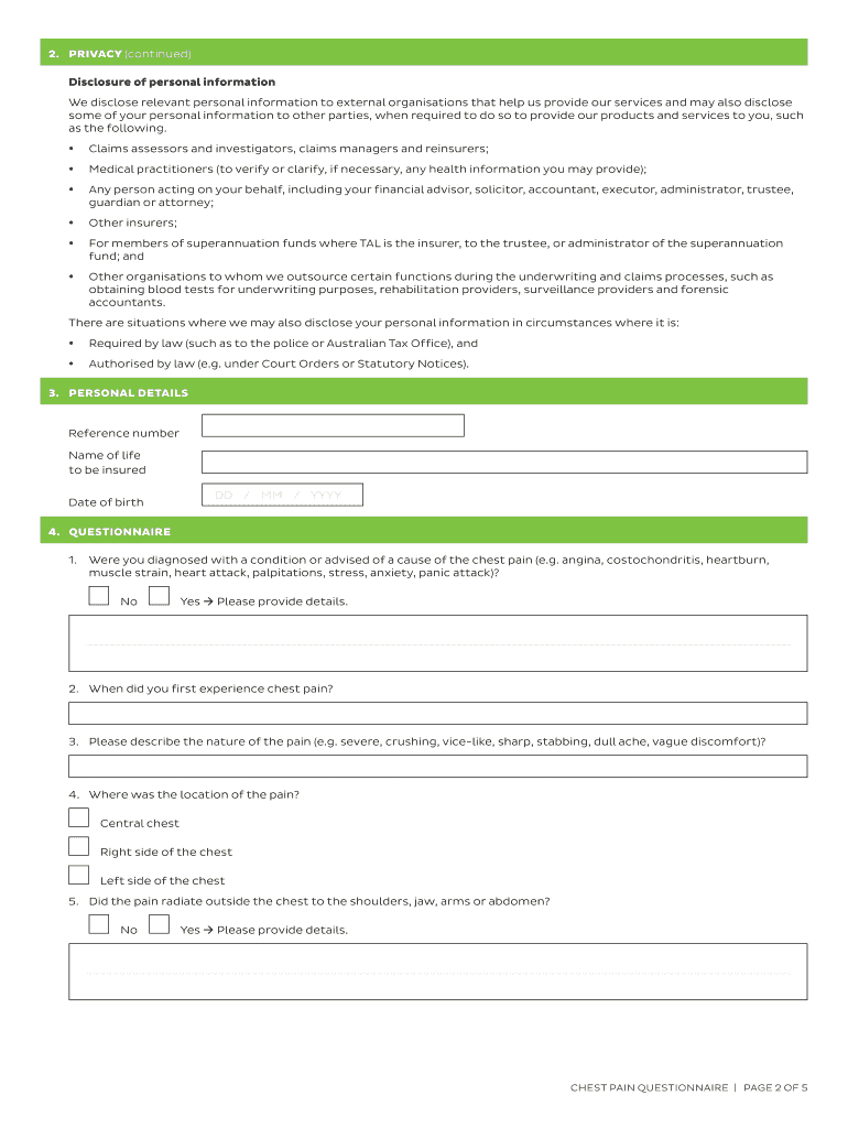 Life InsuranceChest Pain QuestionnaireSAVEPRINTPlease complete the questionnaire and return to TAIL.