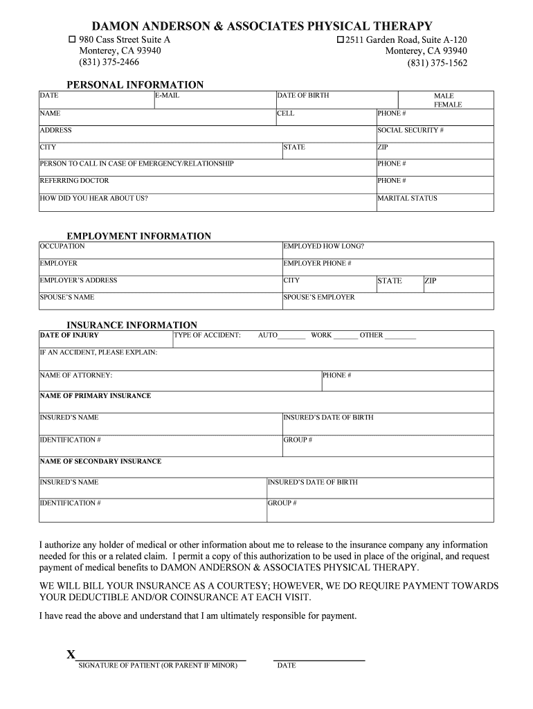 DAMON ANDERSON & ASSOCIATES PHYSICAL THERAPY 980 Class Street S A Monterey, CA 93940 (831) 3752466Monterey, CA 93940 (831) 3751562PERSONAL INFORMATION DATEEMAILNAMEDATE OF BIRTH CELLMATE FEMALE PHONE