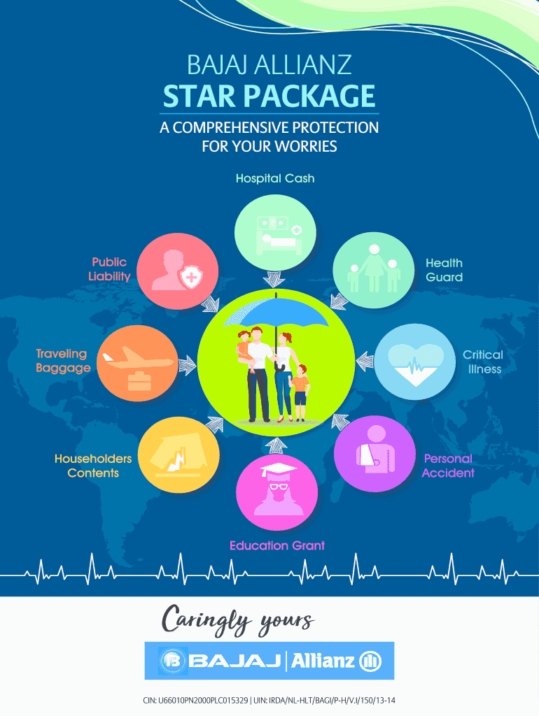 BAJAJ ALLIANZSTAR PACKAGE A COMPREHENSIVE PROTECTION FOR YOUR WORRIES Hospital CashPublic LiabilityHealth GuardTraveling BaggageCritical IllnessPersonal AccidentHouseholders ContentsEducation Granting: