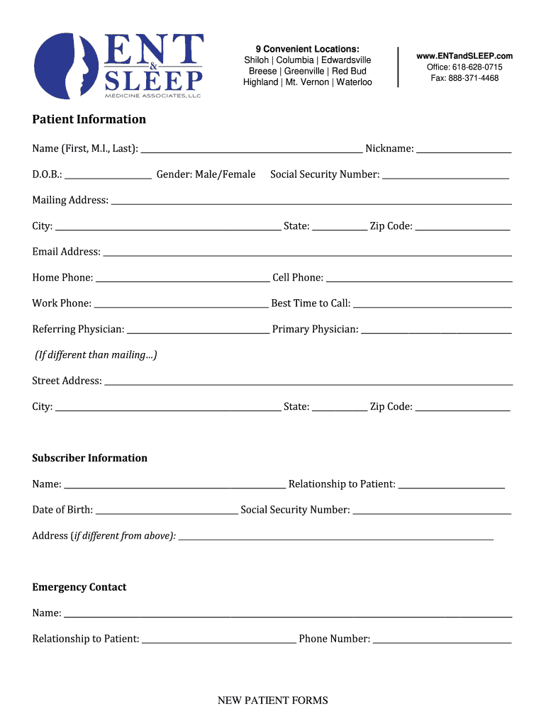 9 Convenient Locations: Shiloh Columbia Edwardsville Reese Greenville Red Bud Highland Mt. Vernon Waterloo.ENTandSLEEP.com Office: 6186280715 Fax: 8883714468Patient Information Name (First, M.I.,