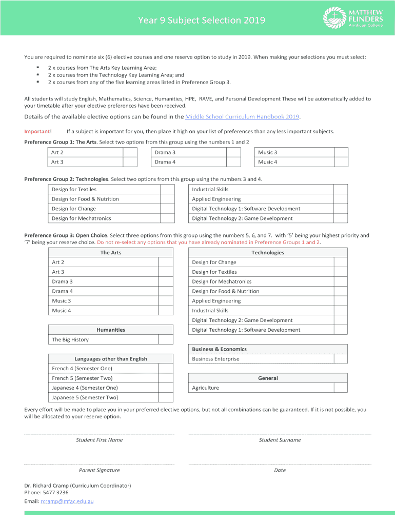 Year 9 Subject Selection 2019You are required to nominate six (6) elective courses and one reserve option to study in 2019. When making your selections you must select: 2 x courses from The Arts Key