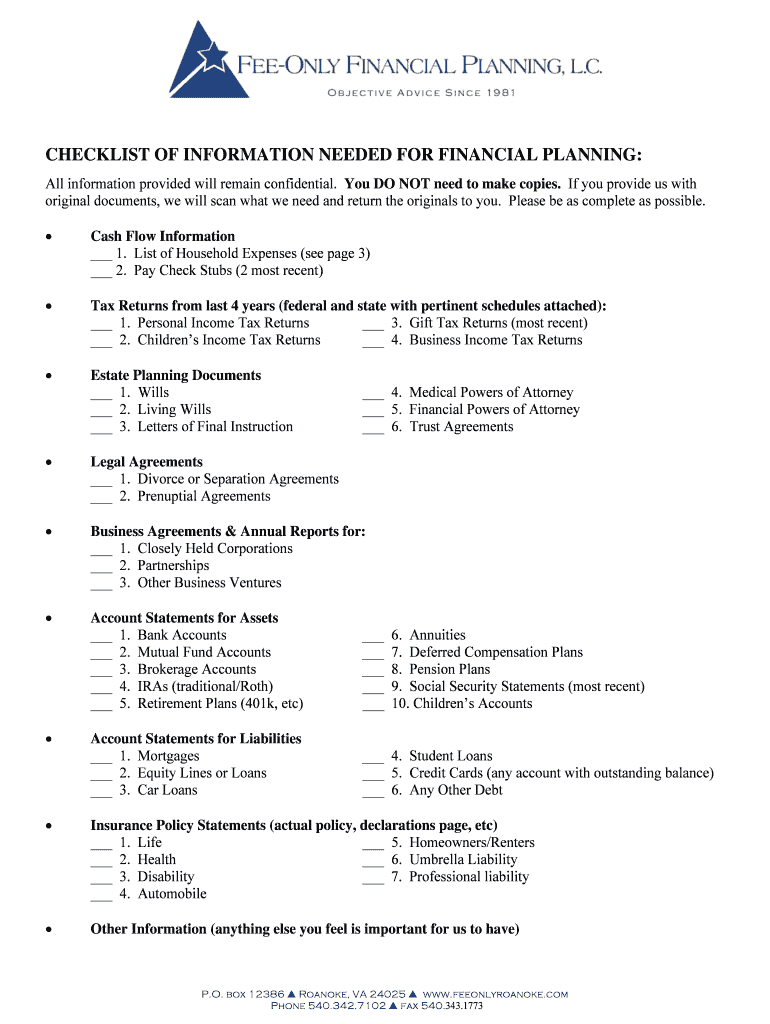 The time to complete the Financial Planning Information Checklist varies based on availability and organization of your financial documents. Typically, it may take from 30 minutes to a couple of hours.