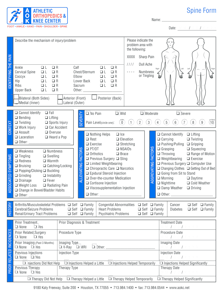 Spine Form Name: Date: M / D / Y Y Y Y Please indicate the problem area with the following:Ankle Cervical Spine Coccyx Hip Ribs Upper Back SL SLR qr qr qr qr qRCONTEXTSEVERITYq Weakness q Numbness