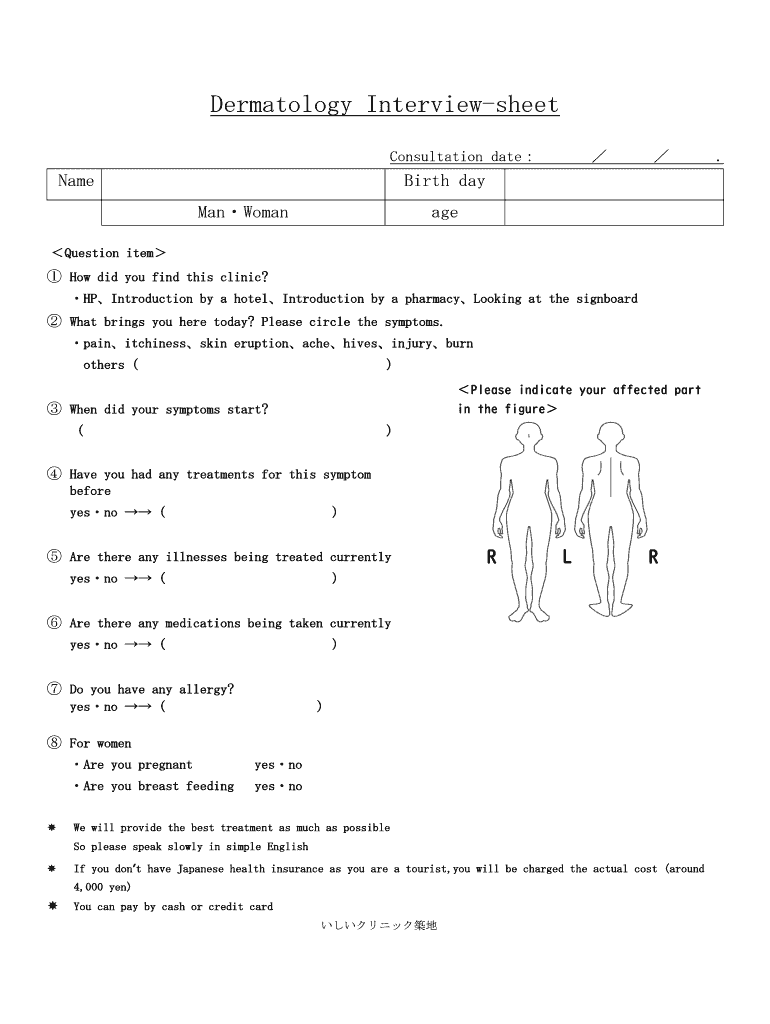 Dermatology Interview sheet Consultation dateNameBirth day ManWomanageQuestion item How did you find this clinic? Introduction by a hotelIntroduction by a pharmacyLooking at the signboard What brings