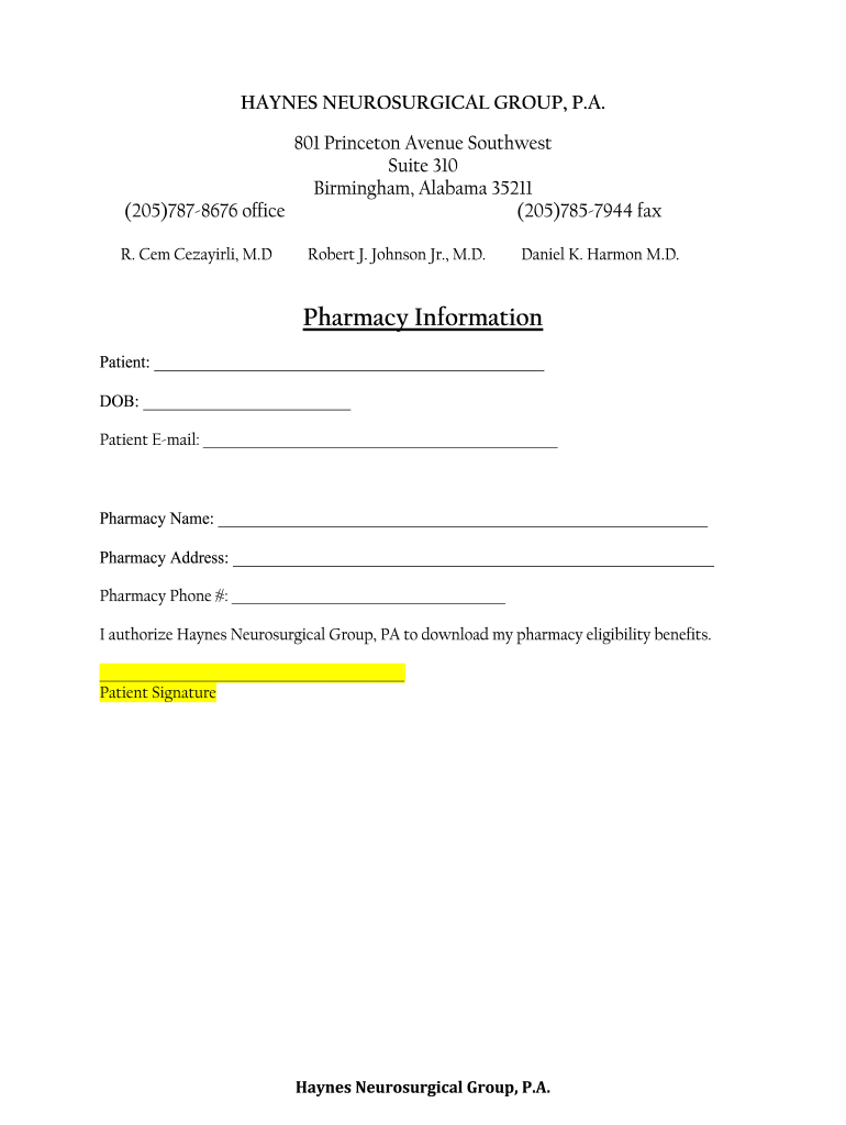 HAYNES NEUROSURGICAL GROUP, P.A. 801 Princeton Avenue Southwest Suite 310 Birmingham, Alabama 35211 (205)7878676 office (205)7857944 fax R. CEM Cezayirli, M. Robert J. Johnson Jr., M.D. Daniel K.