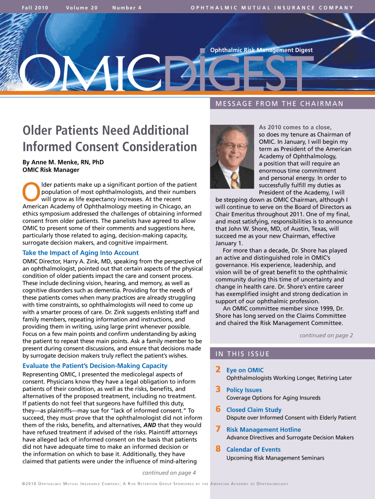 F an l 2 0 1 0 V o l u m e 2 0 OPHTHALMIC MUTUAL INSURANCE COMPANYNumber 4Ophthalmic Risk Management DigestMESSAGE FROM THE CHAIRMANOlder Patients Need Additional