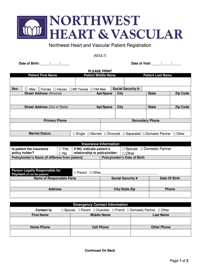 Northwest Heart and Vascular Patient Registration (ADULT) Date of Birth: / / PLEASE PRINT Patient Middle Impatient First Name Sex:Date of Visit: / / Patient Last Name Female Intersex MTF Female FTM