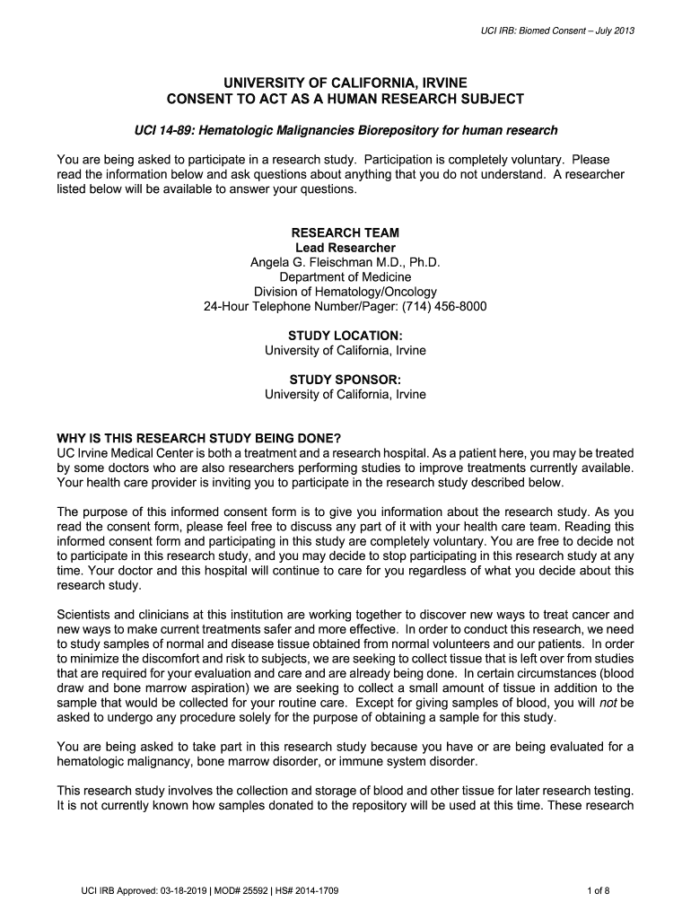 UCI IRB: Boomed Consent July 2013UNIVERSITY OF CALIFORNIA, IRVINE CONSENT TO ACT AS A HUMAN RESEARCH SUBJECT UCI 1489: Hematologic Malignancies Biorepository for human research You are being asked