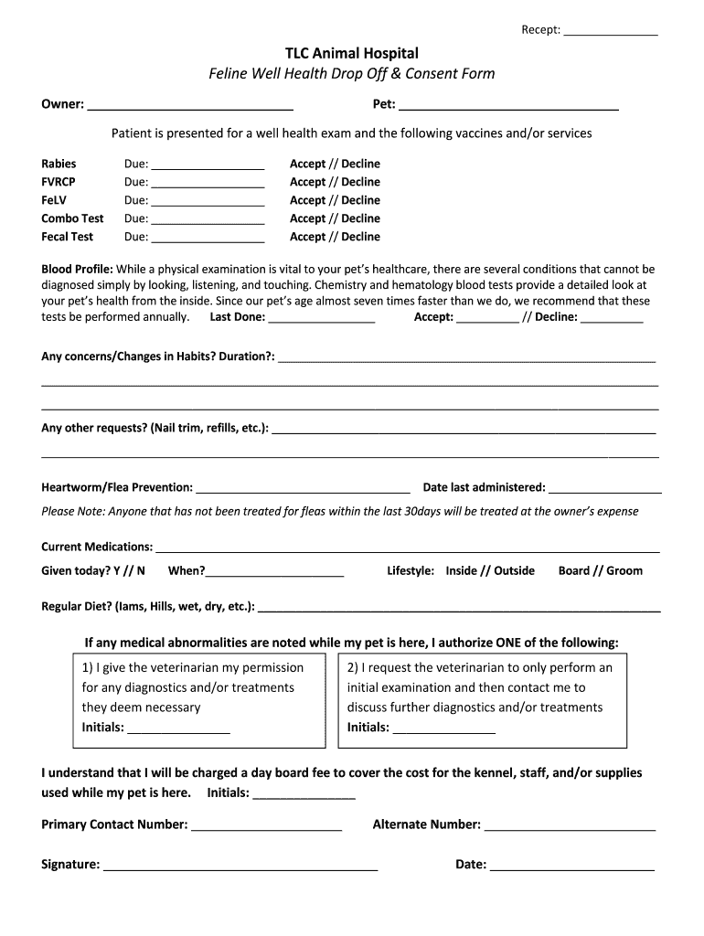Recent: TLC Animal Hospital Feline Well Health Drop Off & Consent Form Owner: Pet: Patient is presented for a well health exam and the following vaccines and/or services Rabies FORCE Fell Combo Test
