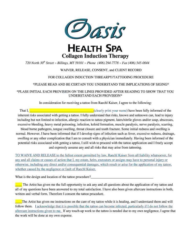 Collagen Induction Therapy 720 North 30th Street Billings, MT 59101 Phone (406) 2947778 Fax (406) 5450044 WAIVER, RELEASE, CONSENT, and CLIENT RECORD FOR COLLAGEN INDUCTION THREADY/TATTOOING PROCEDURE
