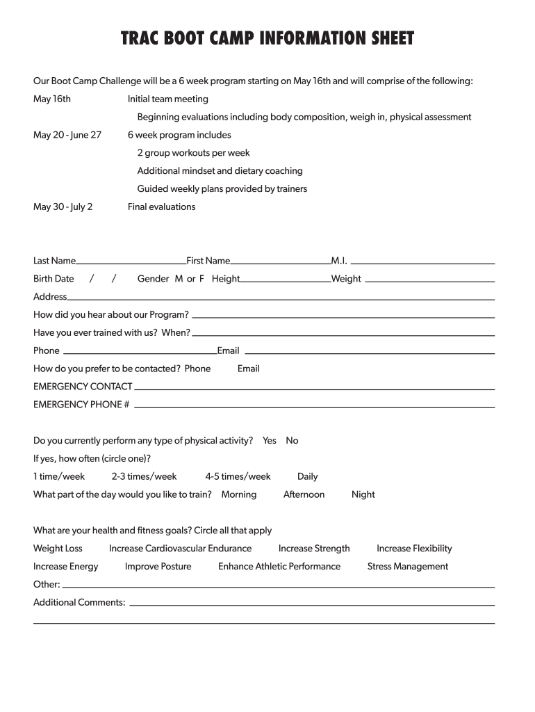TRACK BOOT CAMP INFORMATION SHEET Our Boot Camp Challenge will be a 6-week program starting on May 16th and will be composed of the following: May 16thInitial team meetingBeginning evaluations including