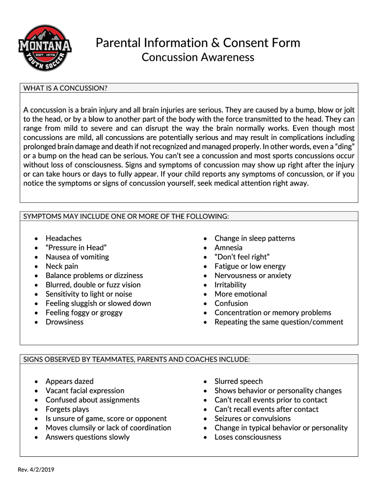 Parental Information & Consent Form Concussion Awareness WHAT IS A CONCUSSION? A concussion is a brain injury and all brain injuries are serious. They are caused by a bump, blow or jolt to the head,
