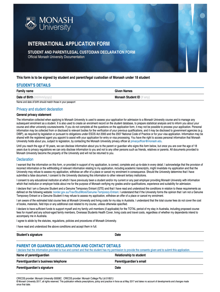 Official Monash University Documentations form is to be signed by student and parent/legal custodian of