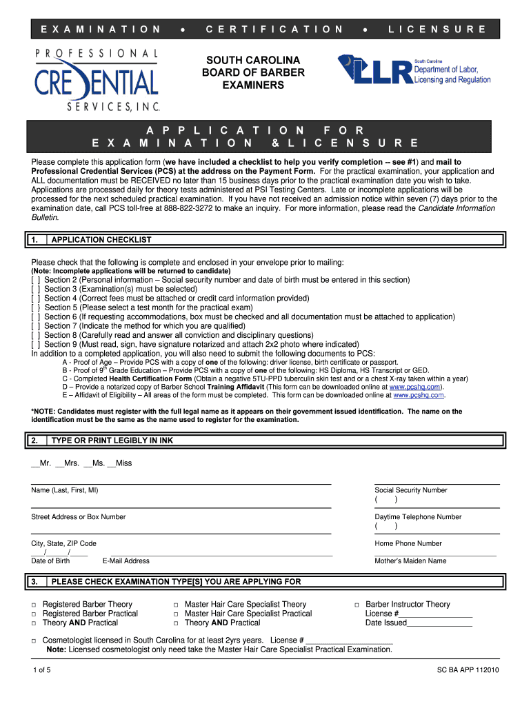 E × A M I N A T I O NC E R T I F I C A T I O NL I C E N S You're SOUTH CAROLINA BOARD OF BARBER EXAMINERS P L I C A T I O N F O R E × A M I N A T I O N & L I C E N S U R E Please complete this application